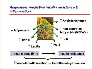 Das überschüssige Fettgewebe produziert mehrere Produkte, sogenannte Adipokine, welche einen negativen Einfluss auf das Endothel ausüben (s. Abbildung 1). Dazu gehören die «NEFA» (nonesterified fatty acids), Zytokine wie TNFa und Interleukin-6 sowie Leptin. Hohe NEFA-Spiegel im Plasma führen zu einer Lipidüberladung der Muskulatur und der Leber, was die Insulinresistenz fördert. Das einzige «protektive» Adipokin «Adiponectin» hingegen wird vermindert, was mit einer Verschlechterung der metabolischen Risikofaktoren korreliert.