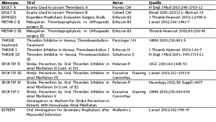 2. Therapie der Beinvenenthrombose (THRIVE): Ximelagatran 36mg zweimal tgl. war der konventionellen Therapie mit Enoxaparin und Warfarin nach 6 Monaten Therapie bei tiefer Beinvenenthrombose bzgl. Rezidiv einer Thrombose, Blutungen oder Gesamtmortalität nicht unterlegen. Die Langzeittherapie der venösen Thrombose nach 6 Monaten konventioneller Therapie ergab eine signifikant geringere Zahl von symptomatischen Rezidivthrombosen unter 2 x 24mg Ximelagatran tgl. als unter Plazebotherapie bei nicht unterschiedlicher Rate grösserer Blutungen und gleicher Gesamtmortalität.