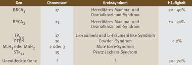 Hereditäre Mammakarzinome bei Keimzellmutationen in einzelnen Genen machen nur 5 - 10% aller Brustkrebserkrankungen aus. Tabelle 2 enthält eine Zusammenstellung der heute bekannten ursächlichen Gene und der mit den pathogenen Mutationen in den jeweiligen Genen assoziierten Krebssyndrome. In der Praxis kommt vor allem den BRCA1- und BRCA2-Mutationen eine Bedeutung zu. Allerdings sind nur bei ca. 40% aller vererbbaren Mammakarzinome pathogene Mutationen in einem der BRCA-Gene verifizierbar. Die grösste Anzahl ist wahrscheinlich auf bisher unentdeckte Gene zurückzuführen.