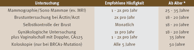 Zur Risikoeinschätzung, ob eine Mutation vorliegen könnte, stehen drei Modelle zur Verfügung, die Daten aus der Familienanamnese und persönlichen Anamnese berücksichtigen. Es sind dies das Gail-, Claus- und BRCAPRO-Modell. Das eigentliche Testverfahren besteht in einer Sequenzierung der DNA des BRCA1- und BRCA2-Gens und bedarf einer Dauer von drei bis sechs Monaten. Hierzu ist eine einmalige Asservierung von 40 mL Blut erforderlich. Welche Tumorvorsorgemassnahmen werden für BRCA1- und BRCA2-Mutationsträgerinnen empfohlen? In erster Linie ist eine engmaschige klinische und radiologische Überwachung (s. Tabelle) zu nennen. Mit keiner der heute gebräuchlichen Screening-Untersuchungen ist es bisher jedoch gelungen, Frühformen des Ovarialkarzinoms zuverlässig zu erfassen. Weiter sollte die Möglichkeit einer präventiven Mastektomie und/oder Ovarektomie diskutiert werden. Mehrere Publikationen belegen deren klare Überlegenheit punkto anhaltender Tumorfreiheit im Vergleich zur alleinigen Überwachung.