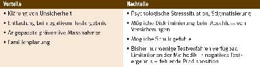 Die Vor- und Nachteile, die sich aus einer genetischen Testung ergeben, sind in der Tabelle 1 zusammengefasst.