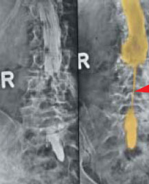 Myelo-CT-Darstellung bei mehrsegmentalen, deutlichen degenerativen Veränderungen besteht ein deutlicher Kontrastmittelstopp. Im rechten Bild künstlich nachgezeichnet, wurde mit rotem Pfeil der Bereich der Spinalkanalstenose lumbal dargestellt.