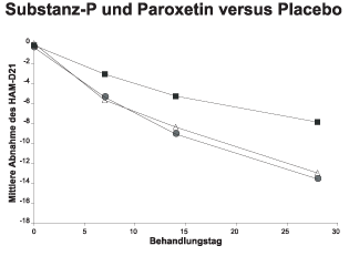 Abbildung 1a: Mittlere Abnahme der Hamilton Depressionswerte HAM-D21 vom jeweiligen Ausgangswert bei Patienten mit der Diagnose einer "Major Depression". Verglichen wurden der Substanz-P Antagonist MK-869 (Kreise n=66) und Paroxetin (Dreiecke n=68) mit Placebo (Quadrate n=64) [Kramer et al 1998,Science 281:1640-1645].