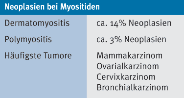 Diese können assoziiert sein mit einer interstitiellen Lungenerkrankung (z.B. Anti-Jo1 positive Myositiden), einer Sklerodermie (Anti-PM-Scl positive Muskelerkrankung) oder mit Hauterscheinungen, die im Rahmen der Dermatomyositis diagnostiziert werden (Anti-Mi2 oder Anti-SRP assoziiert). Da prinzipiell auch die Herzmuskulatur betroffen sein kann, empfiehlt sich ein EKG und eine Echokardiographie durchzuführen. Entzündliche Myopathien, insbesondere die Dermatomyositis, sind häufig mit Neoplasien vergesellschaftet, so dass eine Tumorsuche in jedem Fall empfohlen wird (CT Thorax, Sonographie oder CT Abdomen, gynäkologische Untersuchung bei Frauen, Prostatauntersuchung bei Männern, siehe folgende Tabelle ).