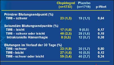 In beiden Gruppen war die 30-Tage-Sterberate mit < 3% für Infarktpatienten ungewöhnlich niedrig. Die Studie lässt zudem keine Aussage über den Nutzen einer Clopidogrel Zusatztherapie bei Patienten im hohem Alter unter Standarddosis Heparin oder bei ACB zu.