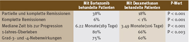 Mit Bortezomib behandelte Patienten hatten eine höhere Ansprechrate, eine längere Zeit bis zur Krankheitsprogression und ein längeres Überleben (Tabelle1)