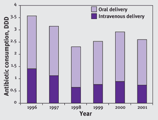 Abbildung 1: Antibiotikaverbrauch (definierte Tagesdosen) pro Patient, zugewiesen an die medizinische Klinik (ohne Intensivpatienten) 1996-2001. Das letzte Jahr vor der Einführung der Intervention war 1996 und 1998 war das Interventionsprogramm voll eingeführt.