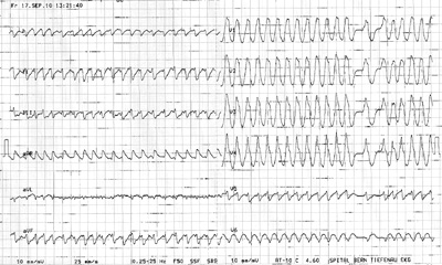 Der Patient versichert, bisher noch nie eine solche Episode erlebt zu haben. Der Blutdruck beträgt 110/75 mmHg, der Puls ist sehr schnell. Hier sein EKG: