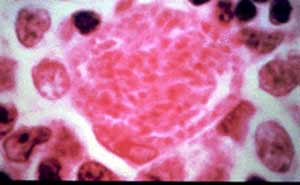 Zur Illustration zeigen wir Ihnen hier eine Histologie des Lymphknotens in HE-Färbung. Unter dem Bild finden Sie die Resultate der Serologien dieses Patienten und die Frage nach der Diagnose.