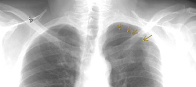 Beim Spitzenpneumothorax ist nur wenig Luft in den Pleuraraum geflossen. Da diese meist nach oben steigt, sammelt sie sich über der Lunge an. Im Röntgenbild sieht man dann die Luftansammlung über der Lungenspitze, daher der Name "Spitzenpenumothorax". Ein Spitzenpneumothorax wird meistens im Röntgenbild bemerkt und macht wie auch in diesem Fall selten Beschwerden im Sinne einer Dyspnoe. |