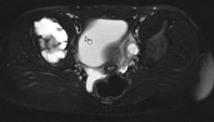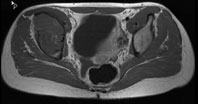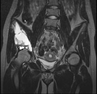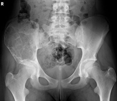 Die Röntgenuntersuchung von Becken/Hüfte zeigt eine septierte geographische Osteolyse in der Ala und im Korpus des Os Iliums rechts. Das Röntgenbild und die Aufnahmen der nachfolgenden MRI-Untersuchung sehen Sie hier: